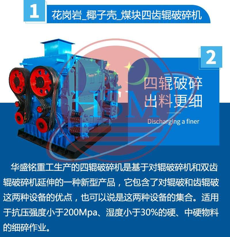 【产品价格】: 电议/面议 【生产能力】: 2-500t/小时 【进料粒度】: ≤90mm 【出料粒度】: ≤0.1-50mm 【应用范围】: 四辊破碎机适用于抗压强度小于200Mpa、湿度小于30%的硬、中硬物料的细碎作业。如焦炭、煤、陶瓷原料、石英石、石灰石、长石、水渣、石膏、粘土等固体物料。 【产品介绍】: 公海贵宾会重工生产的四辊破碎机是基于对辊破碎机和双齿辊破碎机延伸的一种新型产品,它包含了对辊破和齿辊破这两种设备的优点,也可以说是这两种设备的集合。本机器具有使用维修费特低、破碎比大、性能可靠、粉尘少、噪音低等特点。